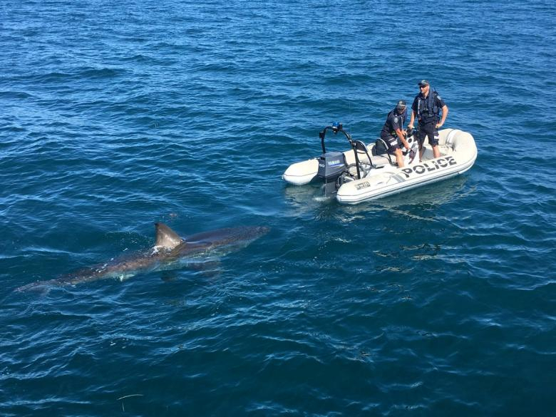 Köpekbalığı Avustralya kıyılarında bir polis teknesinin ardında yüzüyor.