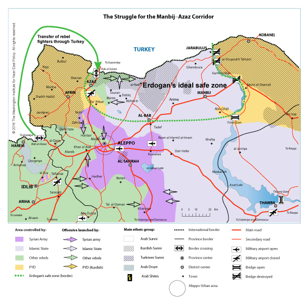 Bununla beraber Türkiye, daha öncede açıkladığı gibi bu senaryoya engel olmada kararlı olduğunu ispatlamıştır. Cumhurbaşkanı Recep Tayyip Erdoğan, yaklaşık 2 ay önce Azez’i koruma altına almak için PYD pozisyonlarını bombalamıştı. Washington ve Şam yetkililerinin açıklamasına göre, binlerce savaşçı Türkiye topraklarını kullanarak İdlip’ten Azez’e geçti. Böylece muhaliflerin geçişlerinin yıkıma uğraması bu adımla engellendi. Sonrasında bu savaşçılar Azez’in doğusunda IŞİD’e karşı savaştı. PYD kuvvetleri ile Suriye Ordusu’nun kendilerine has saldırılara başlamadan önce çatışma sahasını kontrole almak için Erdoğan’ın takip ettiği yöntem işte tam da budur. Aslında bununla Washington’a şu gösterilmek isteniyordu; Türkiye tarafından desteklenen muhalifler, PYD milisleri daha fazla ilerleme kaydetmeden de IŞİD’i hezimete uğratabilir.
