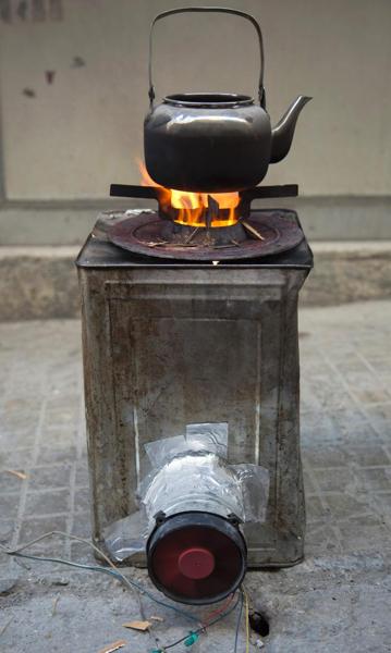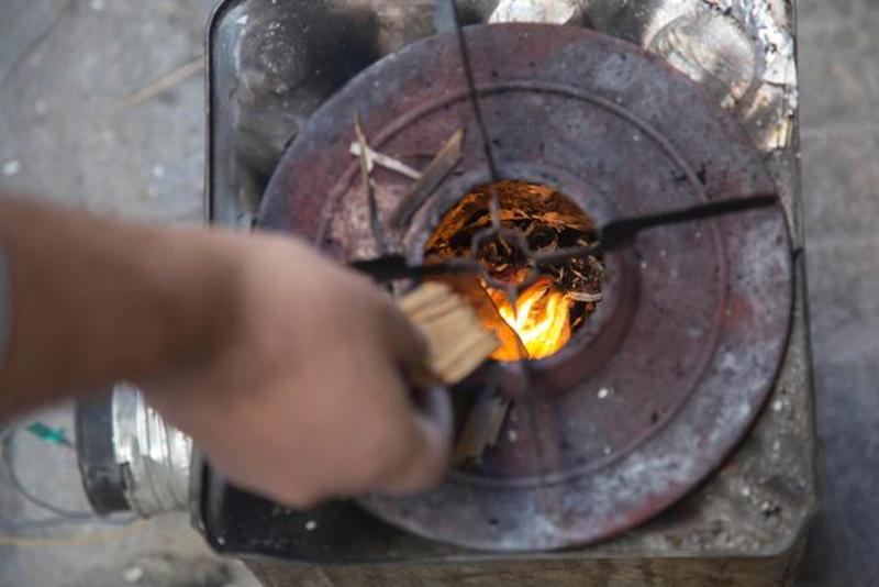 Halid Kürdiye AFP'ye yaptığı açıklamada "atacağımız bir yağ tenekesinde bir delik açtım ve üzerine bir fan sabitledim. Böylece odundan çıkan alevleri tek bir yöne yöneltebiliyoruz ve yakacak odunumuzu daha verimli kullanırken daha büyük bir ateş elde etmiş oluyoruz" ifadesini kullanıyor. 25 yaşındaki Halid birkaç parça odunu kırarak girintili tenekenin içerisine atıyor, ateş yakıyor ve bunu bir çaydanlıkla taçlandırıyor.