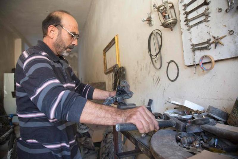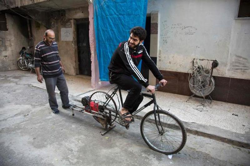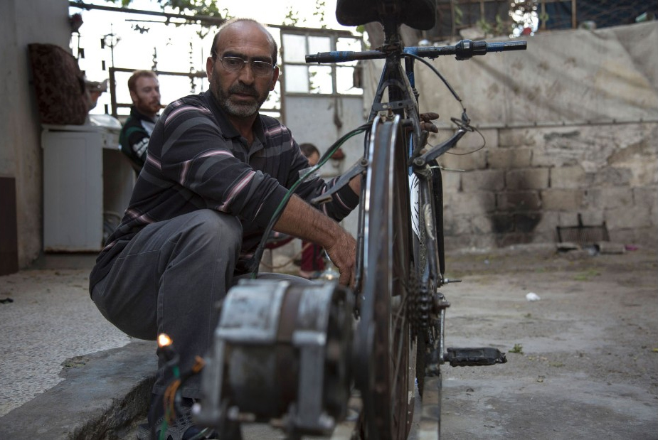 Ensari mahallesindeki atölyesinde 48 yaşındaki tamirci bir dinamo, araba akülerini şarj etmek için ufak bir jeneratör üretti, eski bir bisikletin üzerinde. Ebu Rahmo "ne elektriğimiz var ne de jeneratörümüz. Bu nedenle arabaların dinamolarını çıkardım ve araba akülerini şarj etmek için bir bisikletin üzerine sabitledim" şeklinde konuşuyor. 48 yaşındaki tamirciye göre bu aküler evleri aydınlatmak, telefonları şarj etmek ve hatta çamaşır makinelerini çalıştırmak için kullanılabiliyor.