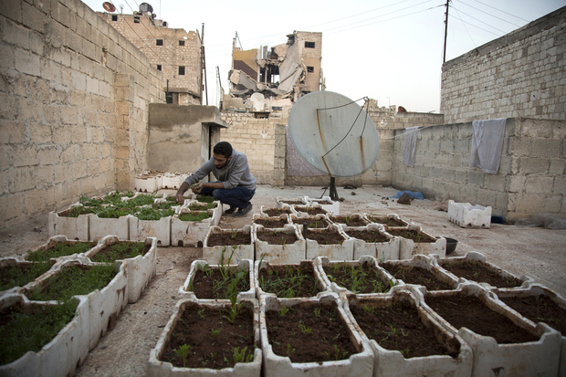 Bu terasta, beyaz strafordan kutular düzgün sıraları halinde tanzim edilmiş, kutuların bazıları parlak yeşil filizlerle dolu. Bitkileri şefkatle okşarken Sendeh "biraz tohum alıp evinin terasına onları ektiğini" söylüyor. Rejim güçleri Temmuz ayında Halep'i muhasara altına aldığından bu yana yiyecek maddelerini bulmak ya oldukça zor ya da bunlar çok pahalı, yahut her ikisi de.