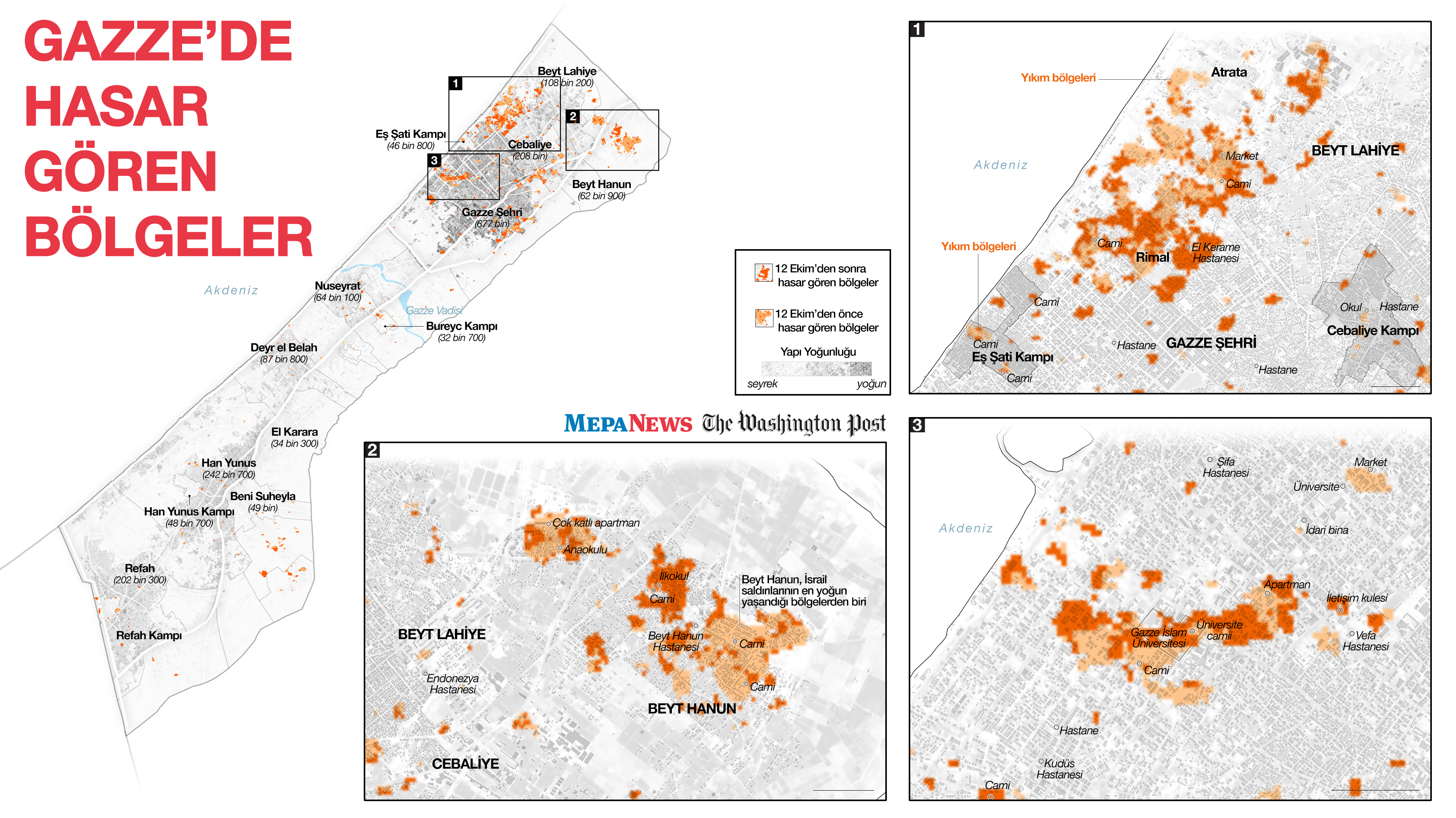İsrail'in yoğun bombardımanlarında özellikle Gazze Şeridi'nin kuzey bölgelerinde birçok yerleşim yeri ağır hasar gördü.