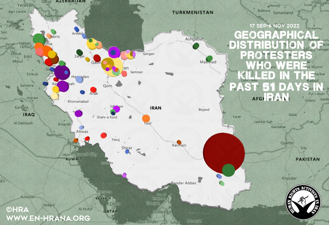 İran merkezli insan hakları kuruluşu Human Rights Activists News Agency tarafından hazırlanan haritada, protestolarda öldürülen göstericilerin hangi bölgelerde öldürüldüklerine yer verildi.