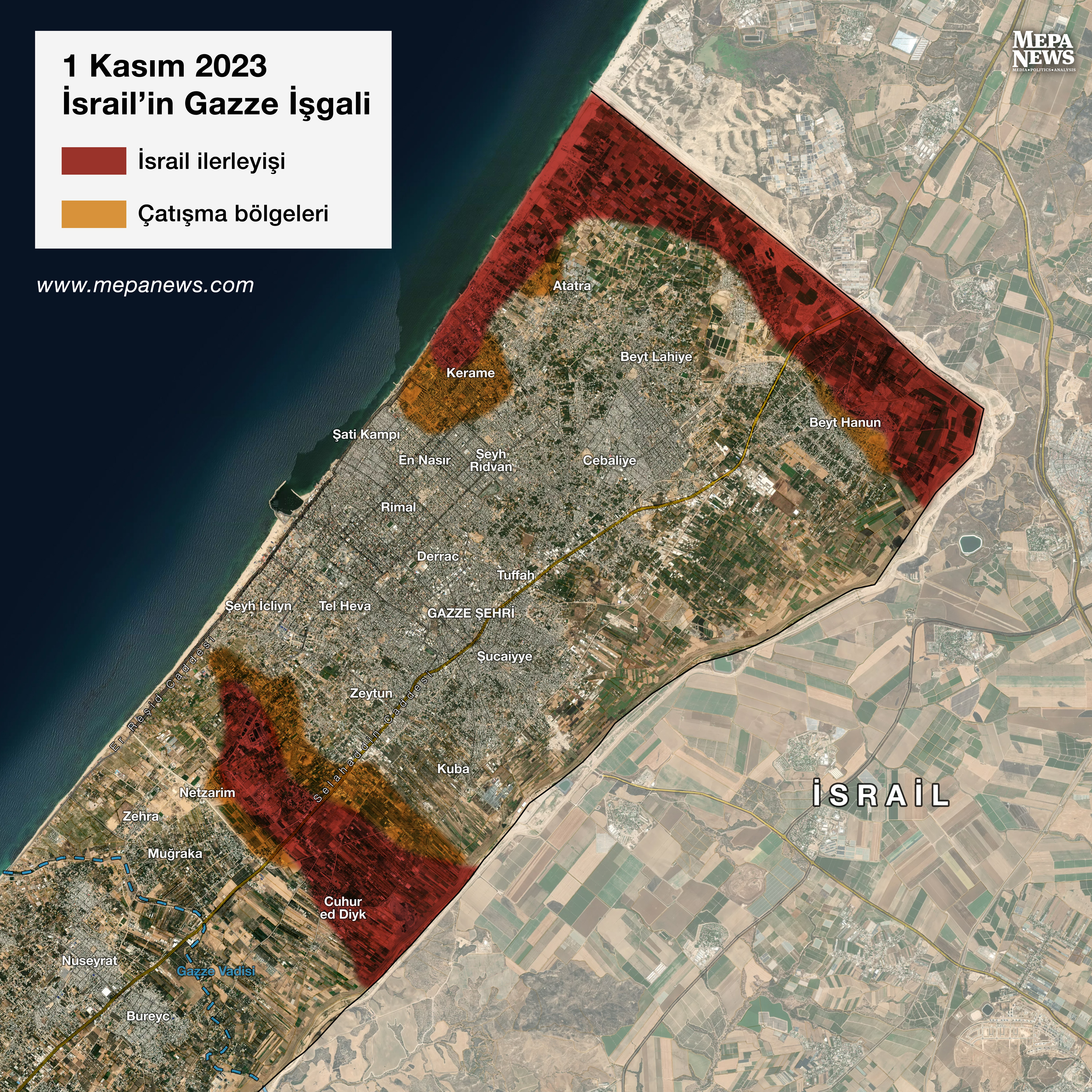 1 Kasım itibarıyla İsrail'in Gazze Şeridi'ne yönelik işgalinde son durum ve yaklaşık kontrol alanları şu şekilde: