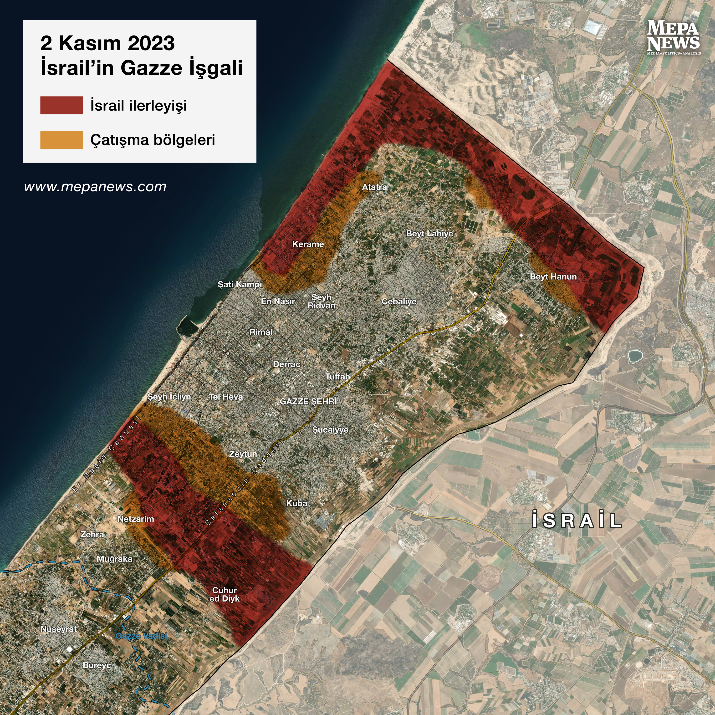 2 Kasım itibarıyla İsrail'in Gazze Şeridi'ne yönelik işgalinde son durum ve yaklaşık kontrol alanları şu şekilde: