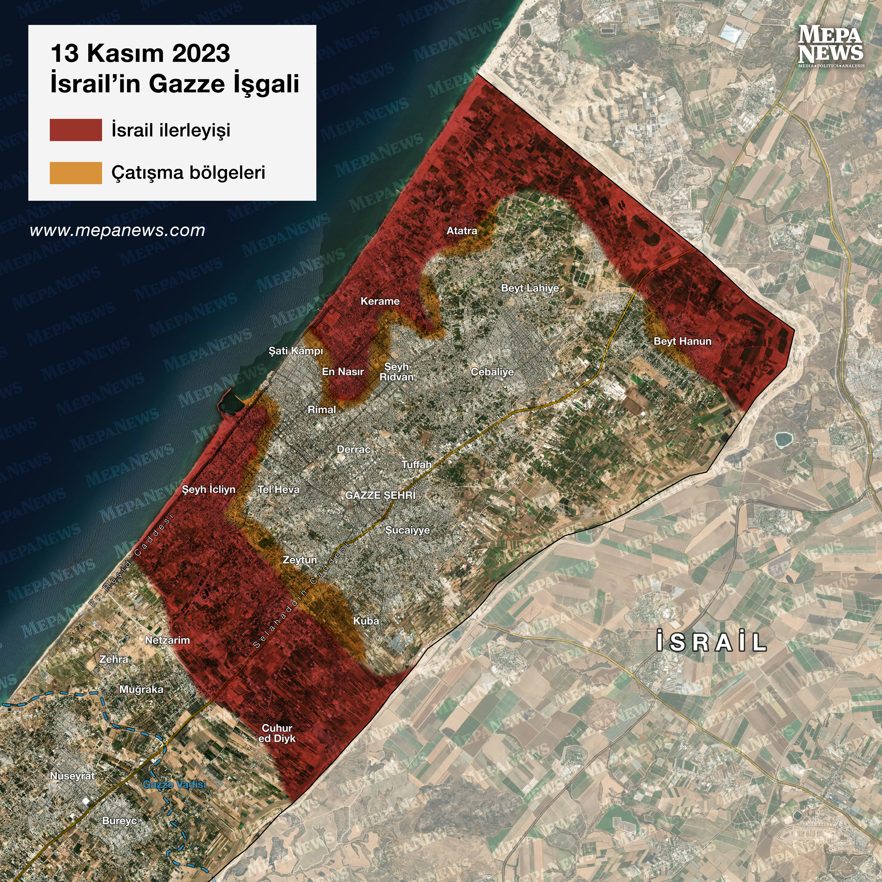 13 Kasım itibarıyla İsrail'in Gazze Şeridi'ne yönelik işgalinde son durum ve yaklaşık kontrol alanları şu şekilde: