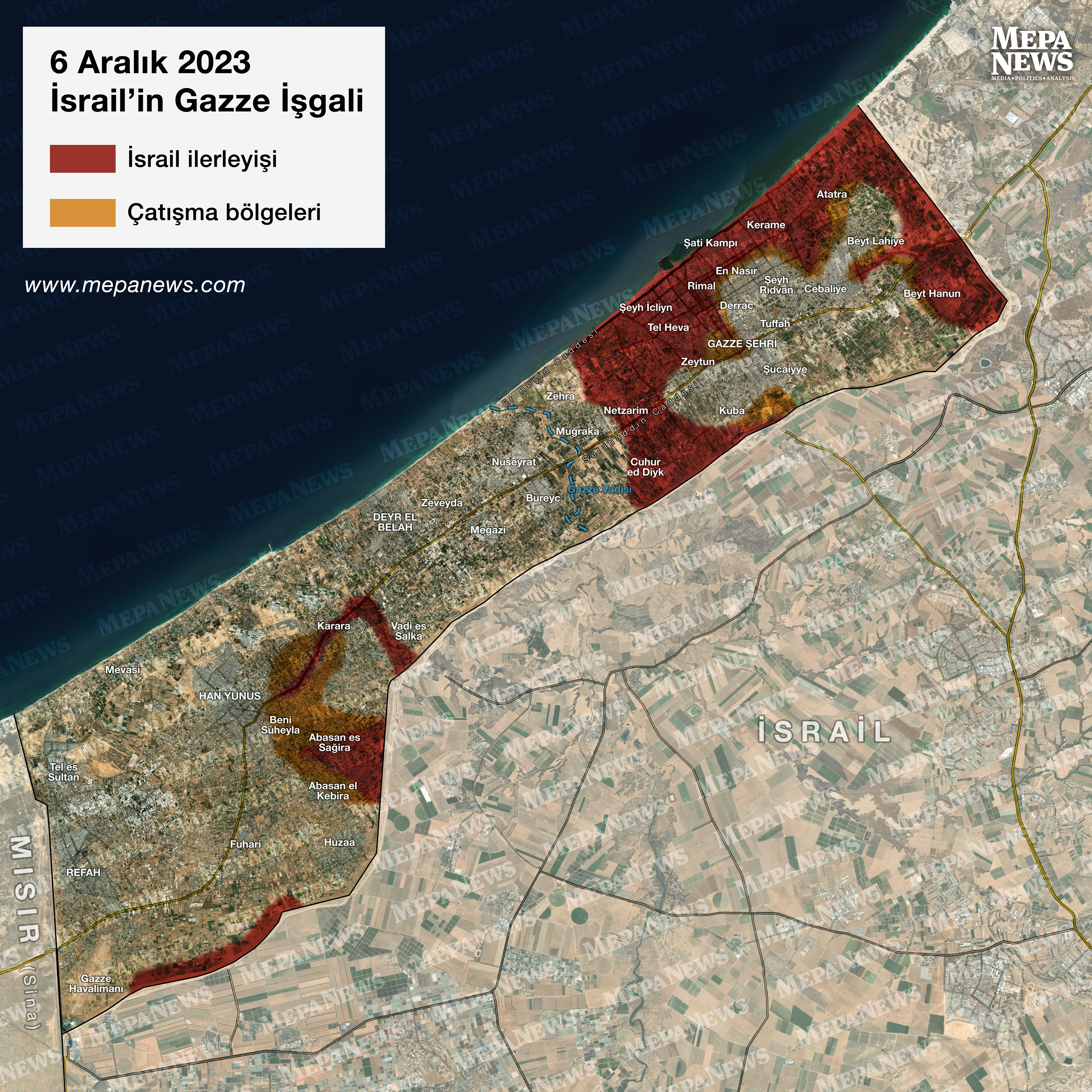 6 Aralık itibarıyla İsrail'in Gazze Şeridi'ne yönelik işgalinde son durum ve yaklaşık kontrol alanları şu şekilde: