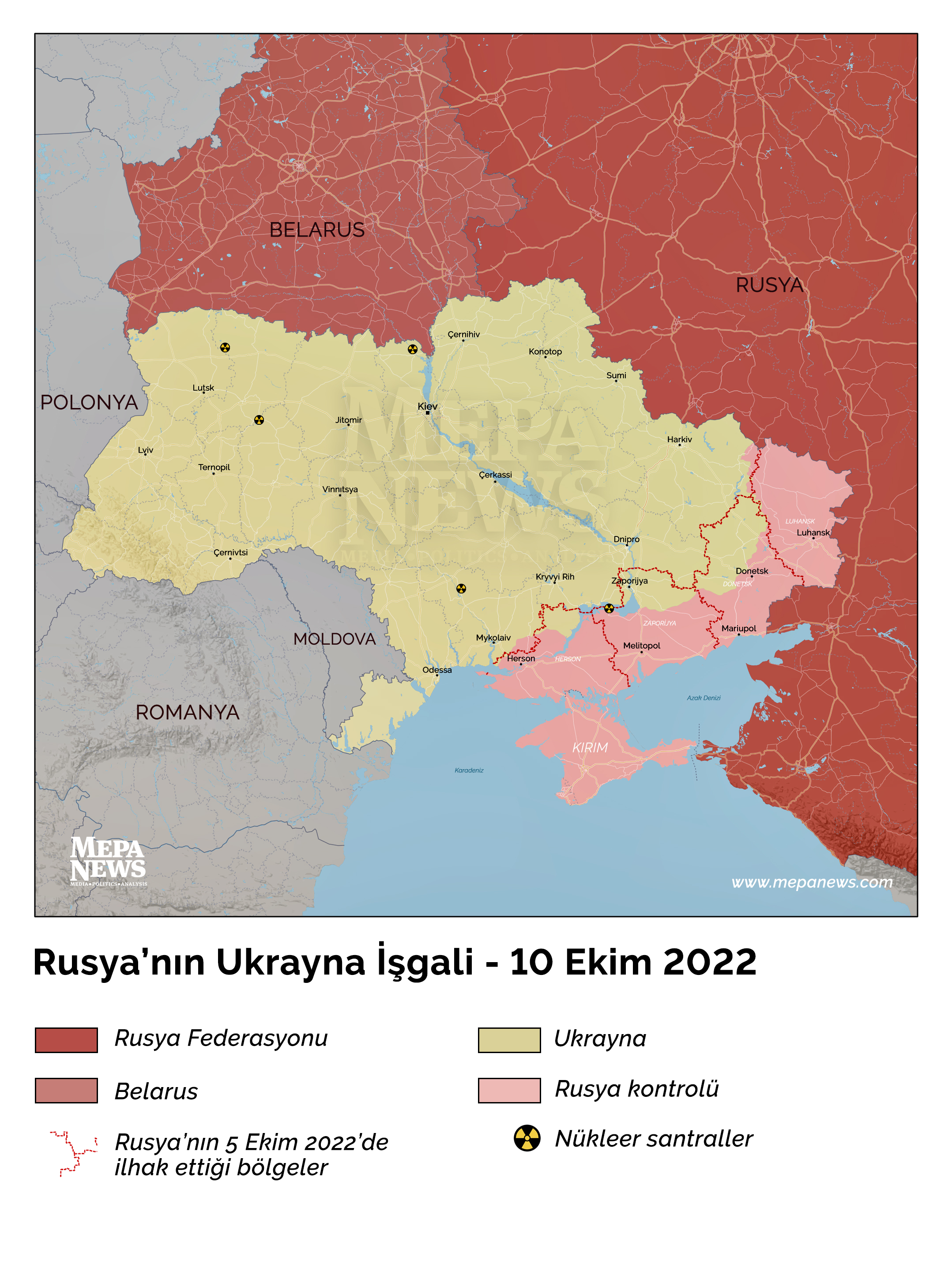 10 Ekim itibarıyla Rusya'nın Ukrayna'ya yönelik işgal harekatında son durum ve yaklaşık kontrol alanlarına dair harita.