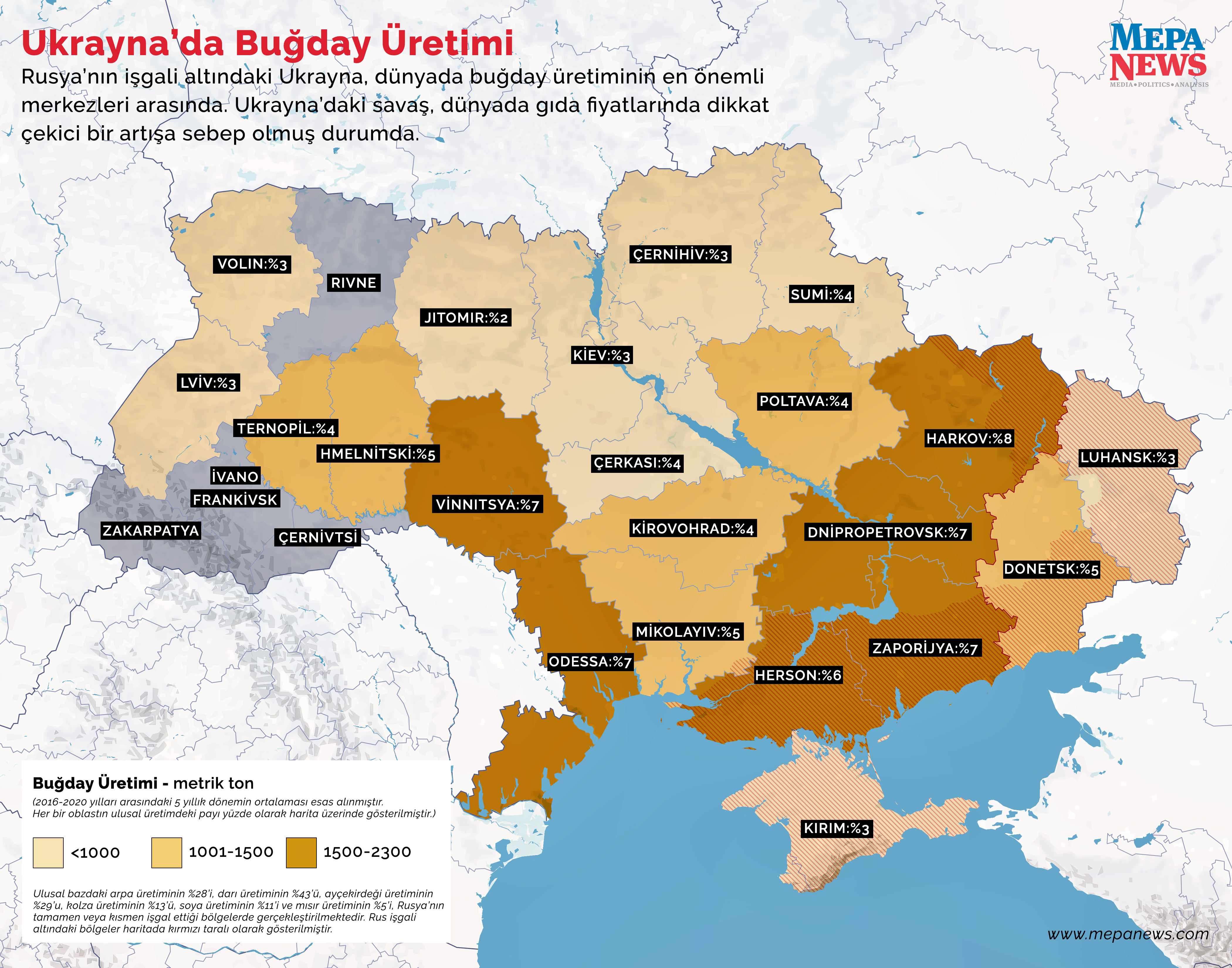 Ukrayna genelindeki arpa üretiminin %28’i, darı üretiminin %43’ü, ayçekirdeği üretiminin %29’u, kolza üretiminin %13’ü, soya üretiminin %11’i ve mısır üretiminin %5’i, Rusya’nın tamamen veya kısmen işgal ettiği bölgelerde gerçekleştiriliyordu.