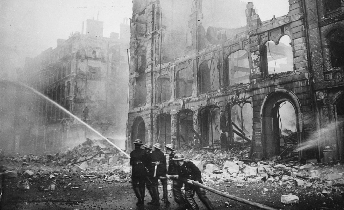 Alman uçaklarının Londra'yı bombalaması sonrası itfaiye yangını söndürmeye çalışıyor