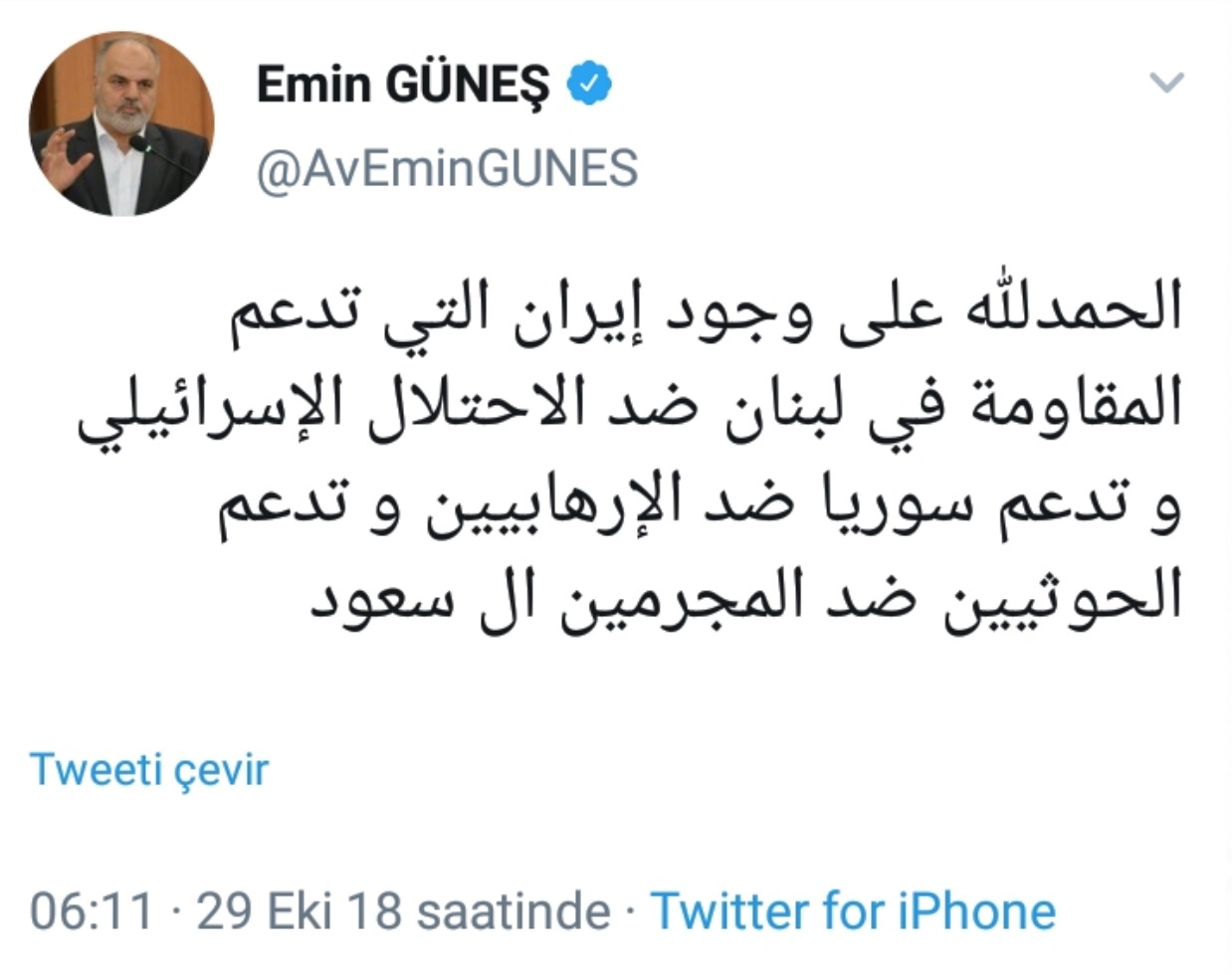 HÜDA PAR Genel İdare Kurulu (GİK) Üyesi Emin Güneş'in Twitter hesabı üzerinden yaptığı Arapça 'İran' paylaşımı tepkilere neden oldu.