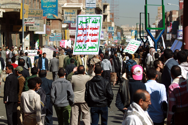 Husi hareketinin destekçileri ellerinde, üzerinde Arapça "Allahu ekber, Amerika'ya ölüm, İsrail'e ölüm, Yahudilere lanet, İslam'a zafer" yazılı pankartlar taşıyor. 26 Ocak 2015, Başkent Sana'a (AFP)