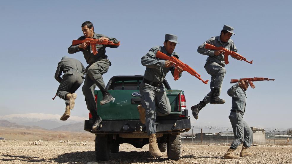 Afgan polis adaylarına, içeriden saldırılara karşı tedbir olarak tahta silahlarla eğitim veriliyor