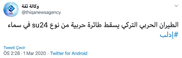 Yerel kaynaklar tarafından aktarılan bilgilere göre, İdlib'in güneyindeki Cebel Zaviye bölgesinde Esed rejimine ait Su-24 tipi savaş uçağı düşürüldü.