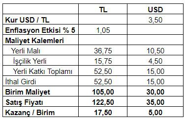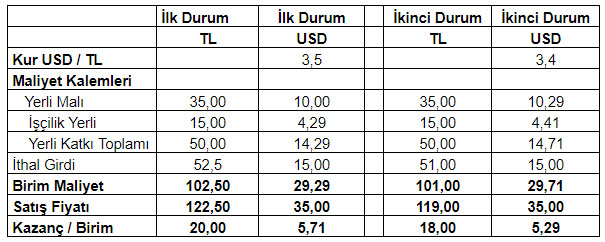 Önce tablonun ilk durum başlıklı bölümlerine bakalım. Dolar / TL kuru 3,5 TL olsun. Bir işletme bir ürünü birim başına 15 Dolarlık ithal girdi (15,00 x 3,50 = 52,50 TL) ve (35,00 TL’si malzeme, 15 TL’si işçilik olmak üzere) 50 TL’lik yerli girdi kullanarak üretiyor olsun. Bu durumda bu işletmenin ürettiği malın birim maliyeti (52,50 + 50,00 =) 102,50 TL (29,29 Dolar) eder. Diyelim ki bu işletme bu malı 35 Dolara ihraç ediyor olsun. Bu durumda bu ihracatçının kazancı birim başına 20 TL (5,71 Dolar) olacaktır.