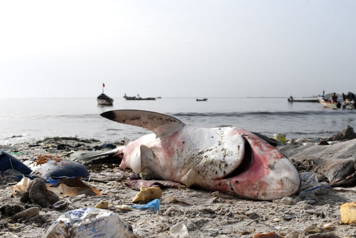 Etrafı çöple çevrili ölü bir köpek balığı Dakar’daki Hann kumsalında yatıyor