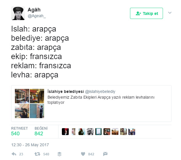Islahiye Belediyesi'nin "Belediyemiz Zabıta Ekipleri Arapça yazılı reklam levhalarını toplatıyor" tweetine gelen şu cevap ise sosyal medyada en çok paylaşılanlar arasına girdi: