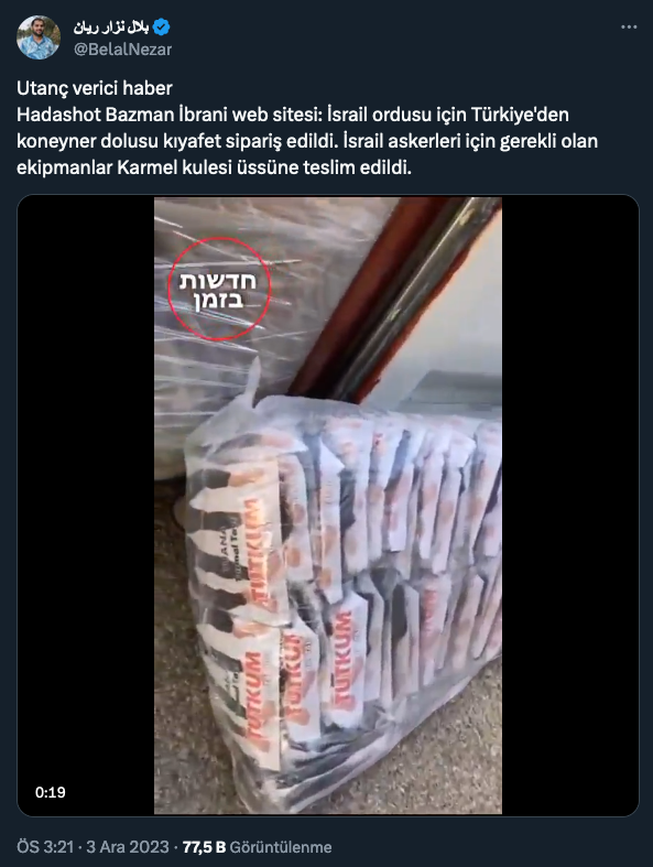 İsrail merkezli Hadashot Bazman'a dayandırılan haberde Türkiye'den İsrail'e konteyner dolusu termal içlik gönderildiği ifade ediliyor.