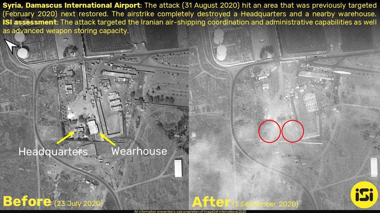 İsrailli ImageSat şirketi tarafından Pazartesi gecesi çekilen uydu görüntülerinde Şam Uluslararası Havalimanı'nda bir komuta merkezi ve bir depo yerle bir edilmiş vaziyette.