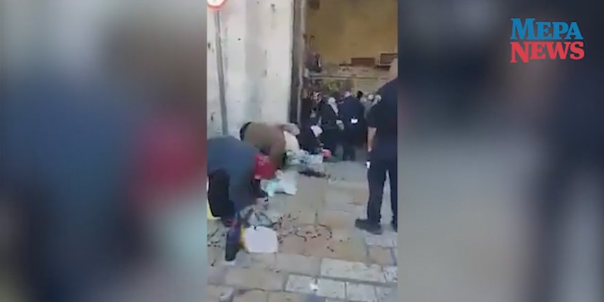 İsrail polisi, Filistinli yaşlı kadın satıcıların ürünlerini etrafa fırlattıktan sonra Filistinli kadınlar sattıklarını yerden toplamak zorunda kaldı.