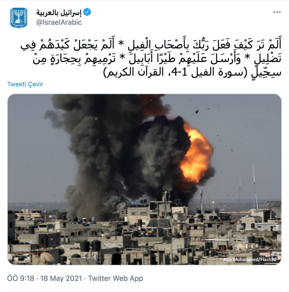 Gazze Şeridi'nde Müslüman halka yönelik saldırılarına devam eden İsrail, saldırılar sürerken Kuran ayetleriyle alay eden bir paylaşımda bulundu.