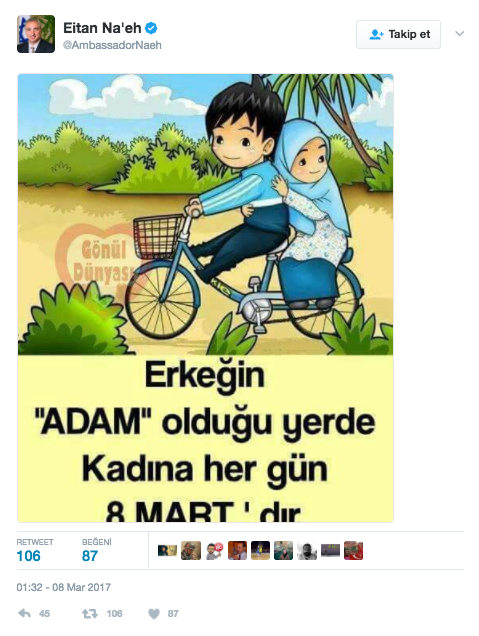 İsrail'in Ankara Büyükelçisi Eitan Na'eh, oldukça ilginç bir '8 Mart Dünya Kadınlar Günü' paylaşımı yaptı.