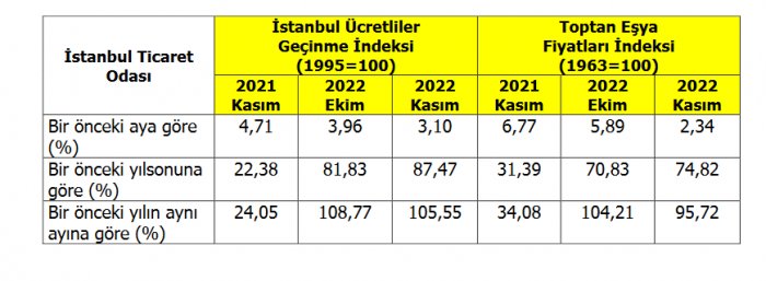 2021 Kasım ayına göre 2022 Kasım ayında yaşanan fiyat değişimlerini gösteren bir önceki yılın aynı ayına göre değişim oranı İstanbul Ticaret Odası'nın (İTO) 1995 bazlı Ücretliler Geçinme İndeksinde % 105,55, Toptan Eşya Fiyatları İndeksinde ise % 95,72 olarak gerçekleşmiştir.