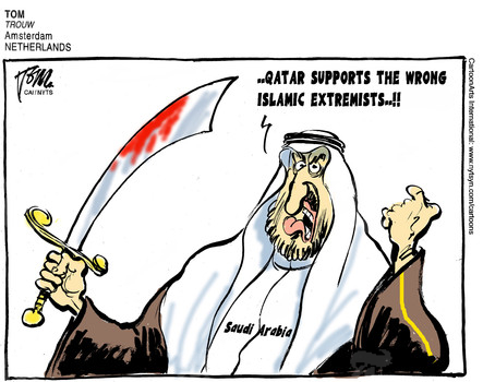 Hollandalı bir çizerin karikatüründe kılıcı kana bulanmış Suud kralı, "Katar yanlış İslamcı aşırıları destekliyor!" diyor: