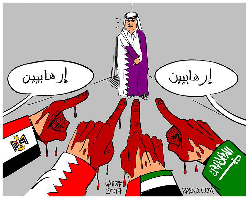 Diğer bir karikatürde 'elleri kanlı' Mısır, Bahreyn, Suudi Arabistan ve Birleşik Arap Emirlikleri'nin Katar emirine "terörist" suçlaması yönelttiği görülüyor: