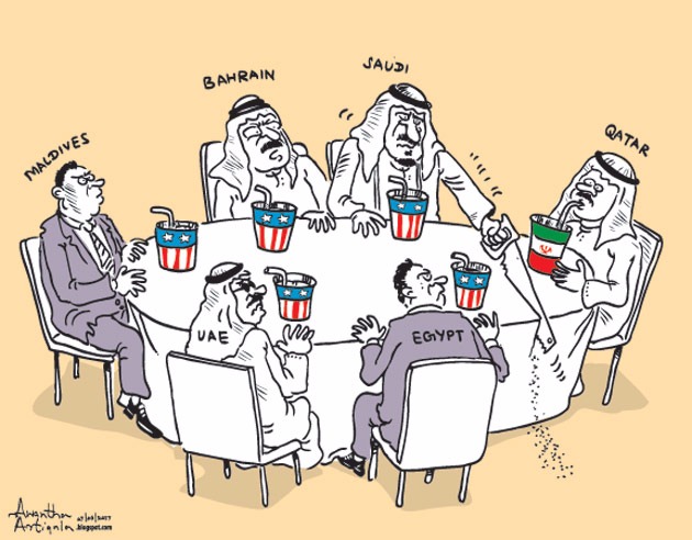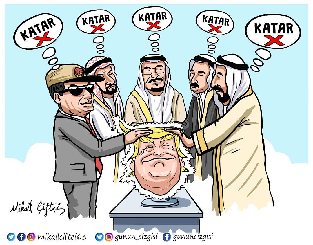 Her ne kadar Katar'ı 'hizaya çekmek' amacıyla 'terörizm' enstrümanı kullanılıyor olsa da, farklı ülkelerden farklı kalemler Körfez ülkelerinin asıl amaçlarını karikatürlerine yansıttılar: