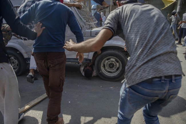 Keşmir'de Hintli güvenlik güçlerine ait bir zırhlı polis aracı sivil göstericileri ezdi.