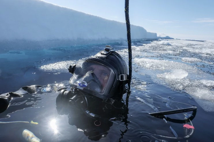 Sahil Güvenlikte görevli bir dalgıç olan Chuck Ashmore okyanusun buzla kaplı zeminini incelemek üzere dalmadan önce partnerini beklerken (30 Temmuz,Bonnie Jo Mount/The Washington Post)