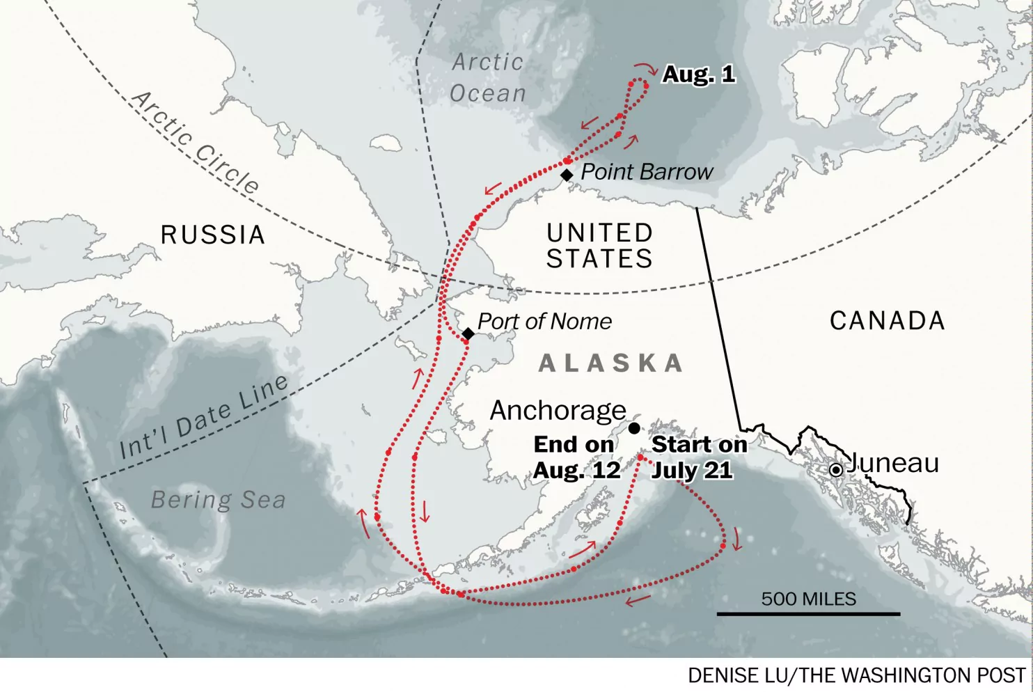 Washington Post’dan bir muhabir ve fotoğrafçı Healy ile birlikte 28 Temmuz ve 6 Ağustos arasında yolculuk yaptı. Ekip gemiye Alaska’nın Cape Lisburne bölgesinden kalkan Sahil Güvenliğe ait bir helikopterle vardı, yolculuk bittiğinde de Nome limanında küçük bir deniz aracıyla da gemiden ayrıldı. Bu süre zarfında gemi geri dönmeden önce ABD’nin en kuzeyi olan Point Barrow’un en az 230 mil kuzeydoğusunu dolaştı.