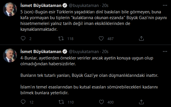 Bunlar, ayetlerden örnekler verirler ancak ayetin konuya uygun olup olmadığından habersizdirler. Bunların tek tutarlı yanları, Büyük Gazi’ye olan düşmanlıklarındaki inattır. İslam’ın temel esaslarından bu kutsal esasları sömürebilecekleri kadarını bilmek bunlara yeterlidir.