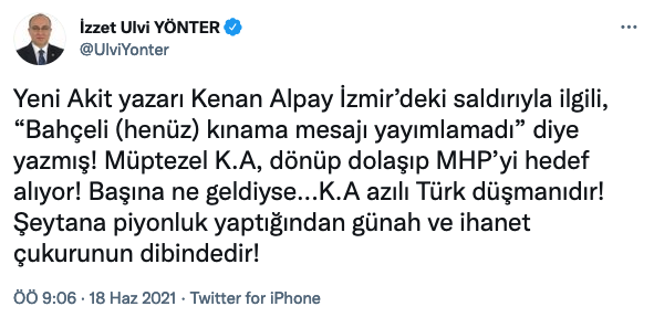 Ayrıca MHP Genel Başkan Yardımcısı İzzet Ulvi Yönter de paylaştığı mesajda gazeteci Alpay'ı "Şeytana piyonluk yapmakla" suçladı.