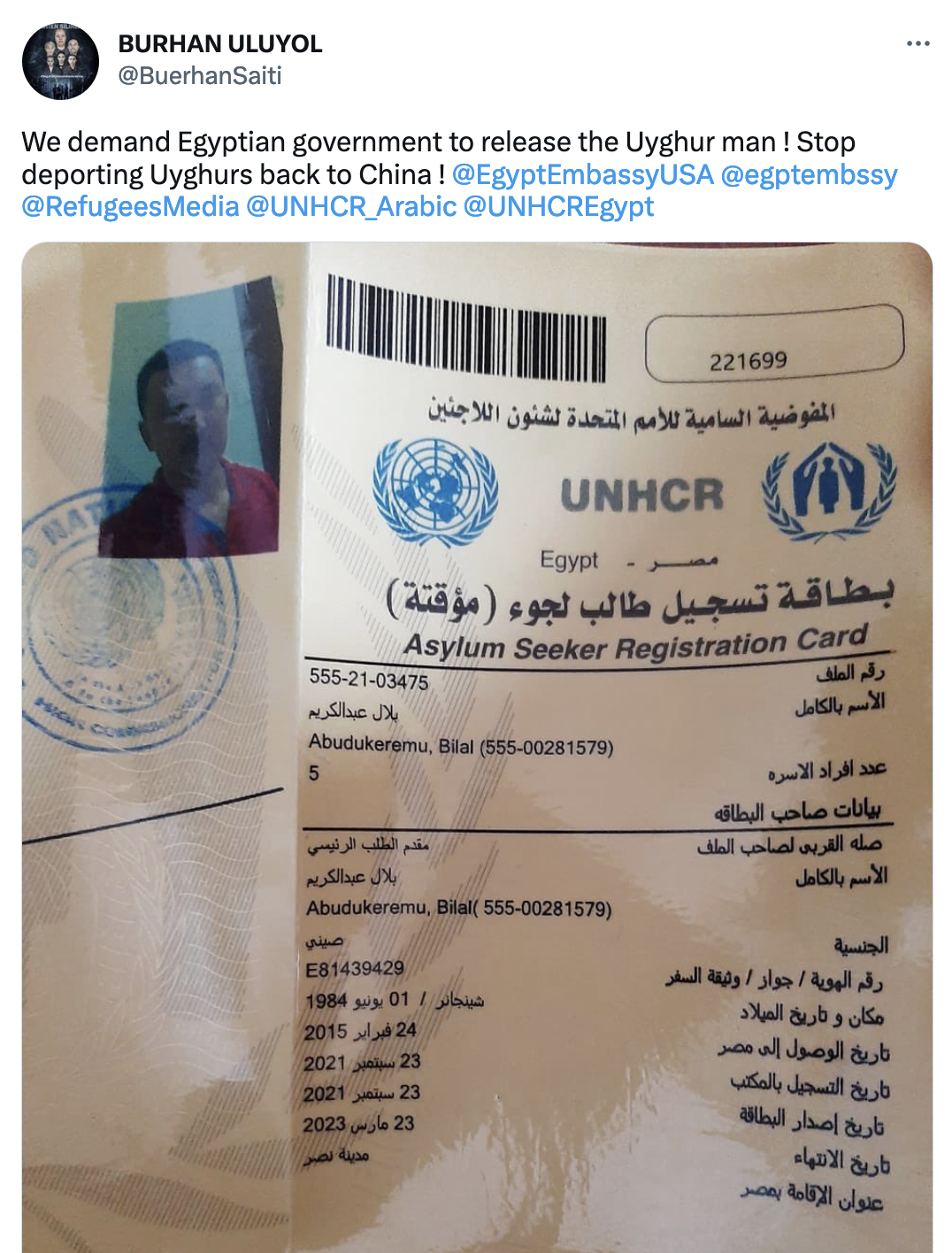 Abdulkerim'in Çin'e iade edilme tehlikesinin bulunduğunu vurgulayan aktivistler, Mısır'da Uygur sığınmacıyı serbest bırakma çağrısında bulundu.
