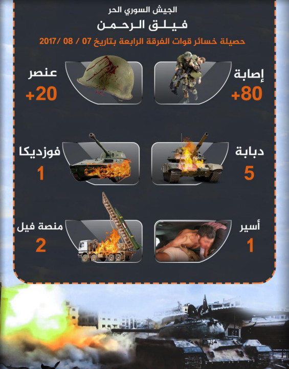 Muhaliflerin yayınladığı rakamlara göre bölgede yaşanan çatışmalarda rejim güçlerinde ait 5 tank ve 1 obüs de tahrip edildi. Ayrıca muhalifler rejime ait bir füze rampasının da tahrip edildiğini ve yaşanan çatışmalarda rejime bağlı güçlerden 1 kişinin canlı olarak esir alındığını açıkladı.