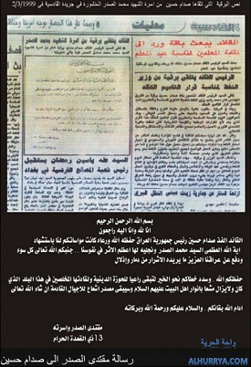 Sadık es Sadr'ın ölümünün ardından oğlu olmasının avantajını kullanarak babasının müesseselerinin başına geçen Mukteda es Sadr, Saddam rejimince yakalanan babasının katil zanlılarının sorgusuna katıldığı gibi cinayeti aydınlattığı için Saddam'a hitaben bir teşekkür mektubu kaleme aldı. Bu mektup dönemin Irak gazetelerinde yayımlandı:
