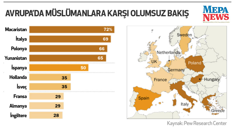 Aynı ankette Avrupalılara, Müslümanlara olumlu mu yoksa olumsuz mu yaklaştıkları da soruldu. Macaristan, İtalya, Polonya ve Yunanistan halklarının çoğunluğu olumsuz yaklaşıma sahip olduklarını kabul ederlerken; Fransa, Almanya, Birleşik Krallık ve diğer Batı Avrupa ülkelerinde sahip olunan yaklaşım çok daha ılımlı ve hatta bazı ülkelerde olumlu şekilde olduğu ortaya koyuldu. Müslümanların daha yoğun şekilde yaşadığı ve diğer kesimlerle yoğun ilişkiye girdiği ülkelerde İslam'a olan olumlu bakış dikkat çekti.