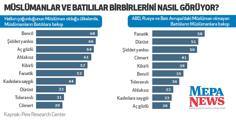 Batılıların Müslümanlara olan bakış açısı çok daha karmaşık. Batı Avrupa’dan 4 ülke, ABD, Rusya’da oluşan katılımcıların %50’si Müslümanları şiddet yanlısı, %58’i fanatik olarak nitelerken; Müslümanlara açgözlü, ahlaksız ve bencil yakıştırması yapanların oranı çok daha düşük çıktı. Batılıların ortalama %22’si Müslümanların kadınlara saygılı olduğu görüşünü beyan ederken %51’i dürüst ve %41’i cömert olarak nitelemeyi tercih etti.