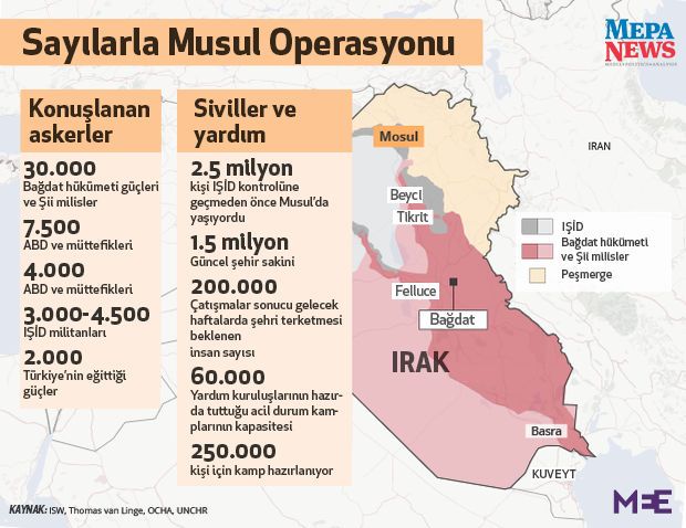 Iraklı ve Kürt güçler Musul şehrinin doğusunda cephe hattına ciddi takviyeler yapıyor. Askerlerin çoğu sevinçten yerinde duramıyor gözükse de gizli bir kaygı da mevcut durumda. En yakın IŞİD mevkileri 2 kilometre mesafede.