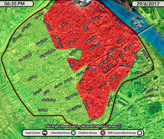Kentin batı kısmındaki Eski Musul semtinde IŞİD'in oldukça dar bir alanı kontrol altında tutabildiği bildiriliyor. Kentin batı yakasındaki operasyonları Bağdat hükümeti güçlerinden Terörle Mücadele Birimi, Federal Polis ve Irak Ordu güçleri yürütüyor.