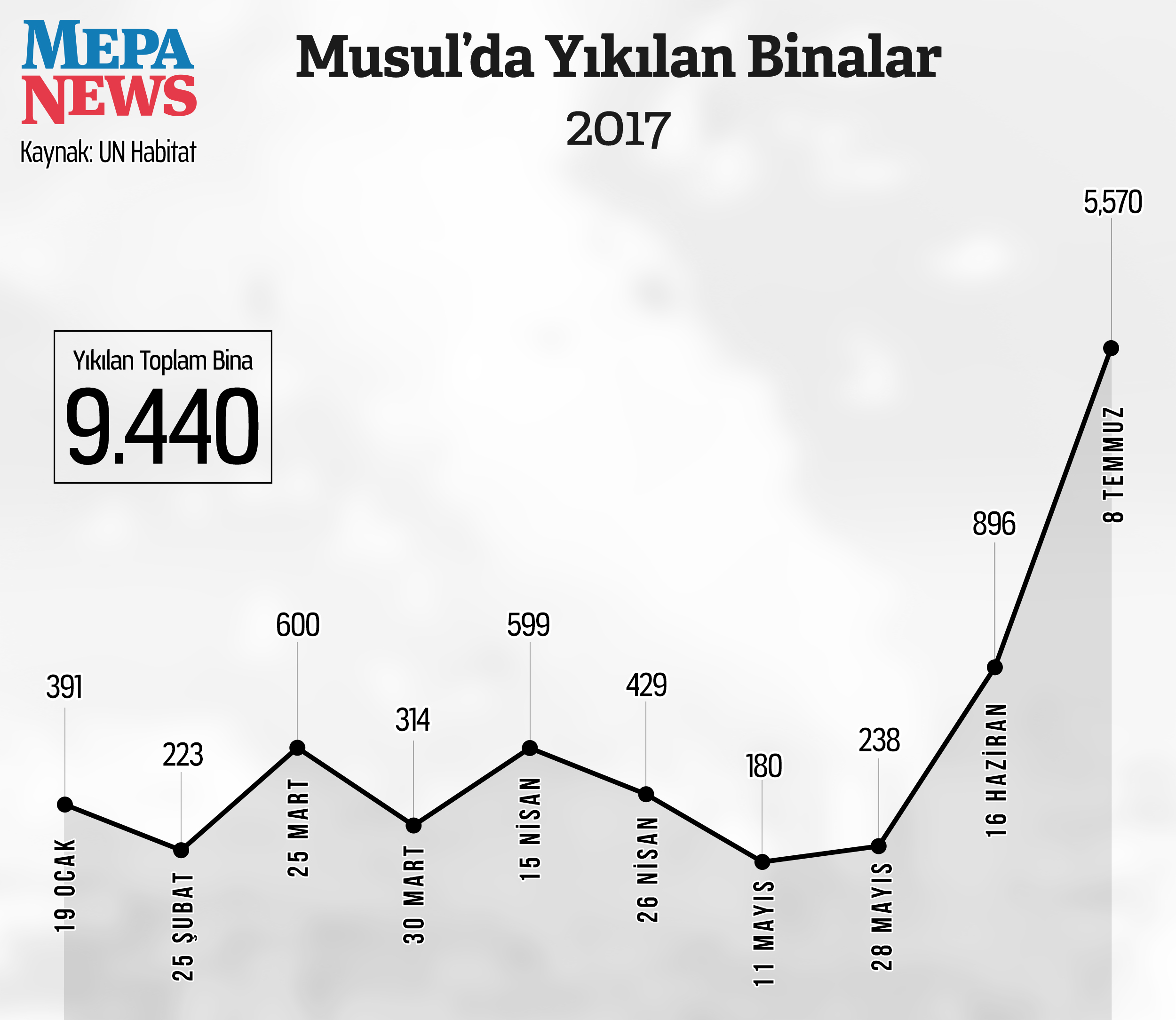 Musul'u IŞİD'ten ele geçirmek için geçtiğimiz yıl başlatılan ve 9 ay süren saldırılar geçtiğimiz günlerde şehrin tamamen ele geçirilmesiyle son bulmuştu. Enkaza dönen şehrin özellikle Batı yakasında tahribat çok büyük boyutlarda.