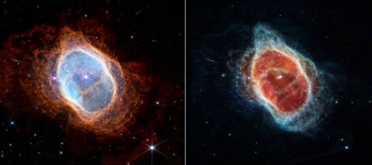 Aynı yeri gösteren görüntülerden soldaki Yakın Kızılötesi Kamera (NIRCam) ile, sağdaki ise Orta Kızılötesi Enstrüman (MIRI) ile çekildi. Parlak olan yıldız, ikil yörüngede dönmeye devam ettikçe gaz ve toz bulutunu havalandırıyor ve asimetrik şekiller yaratıyor.