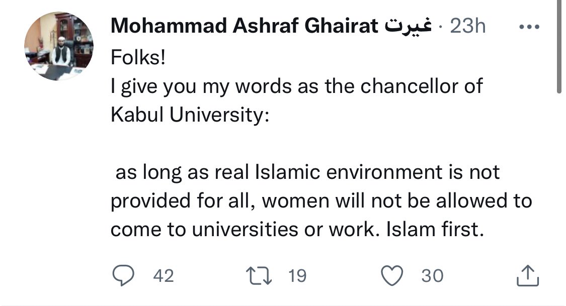 Students from #Kabul University tell me that female faculty and students have been accessing the university as per usual. #NewYorkTimes should really verify their stories before publishing them. University #Chancellor refuses to give interviews. Directives from above I suppose.