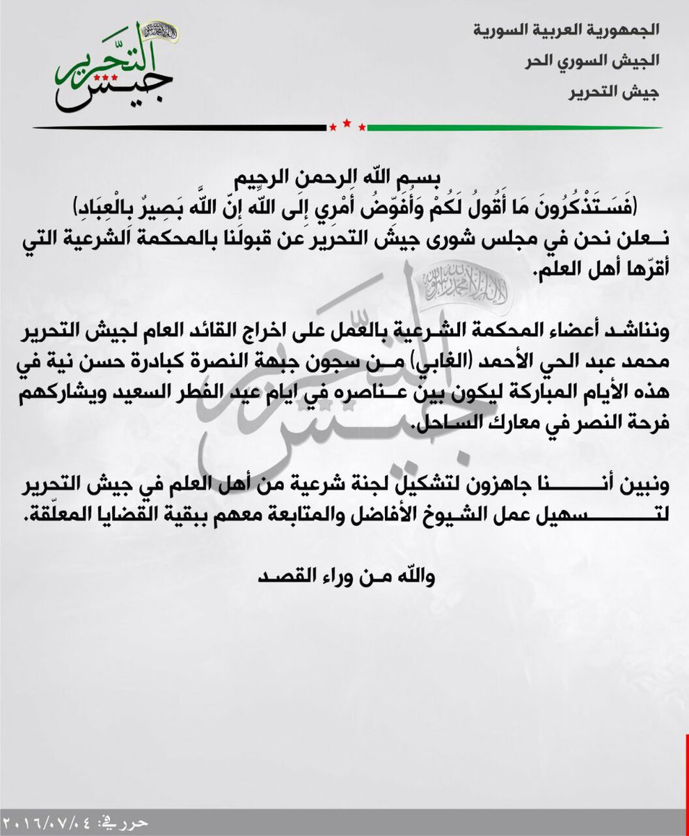 Suriye'de ikamet eden 40 ilim adamı Nusra Cephesi ve Ceyşu't-Tahrir arasındaki sorunların İslami mahkemeye götürülmesi için teklif yayınladı. Bu teklif iki grup tarafından da kabul edildi. Ceyşu't-Tahrir tarafından yapılan açıklamada, "İlim ehlinin İslami mahkeme çağrısına icabet etitğimizi bildiriyoruz. Nusra Cephesi'nin bu mübarek günlerde bir iyi niyet göstergesi olarak genel emirimiz Muhammed el Ğabi'yi serbest bırakması çağrısında bulunuyoruz." denildi.