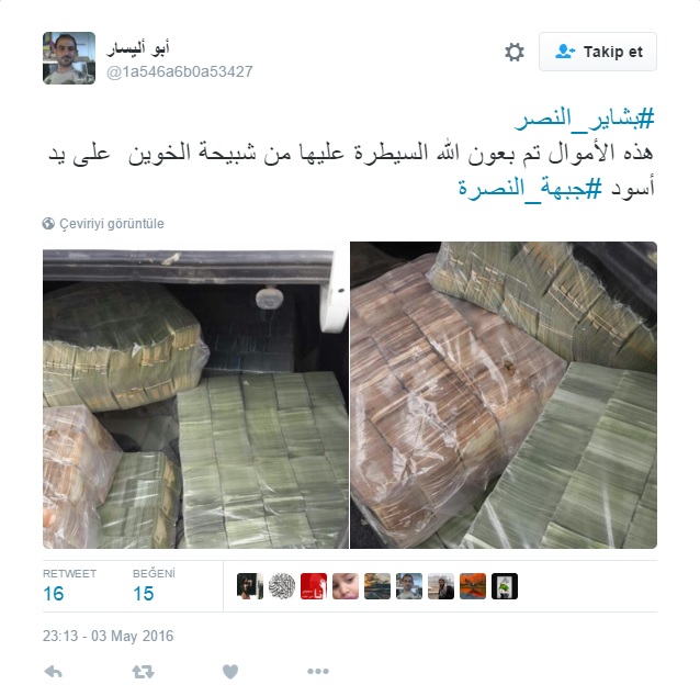 Nusra'nın Huyan kasabasında ele geçirdiği bir milyon doların fotoğrafları sosyal medya kullanıcıları tarafından paylaşıldı.