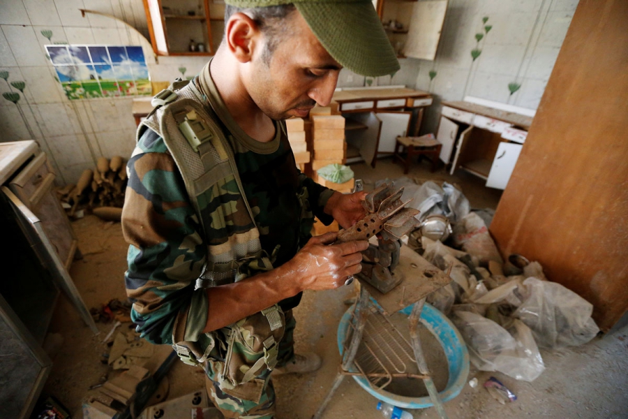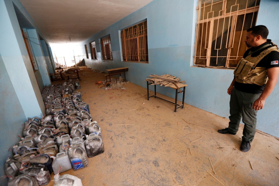 Bir Bağdat Hükümeti güçleri mensubu, Felluce'de IŞİD tarafından bir okulda terkedilen patlayıcılara bakıyor.
