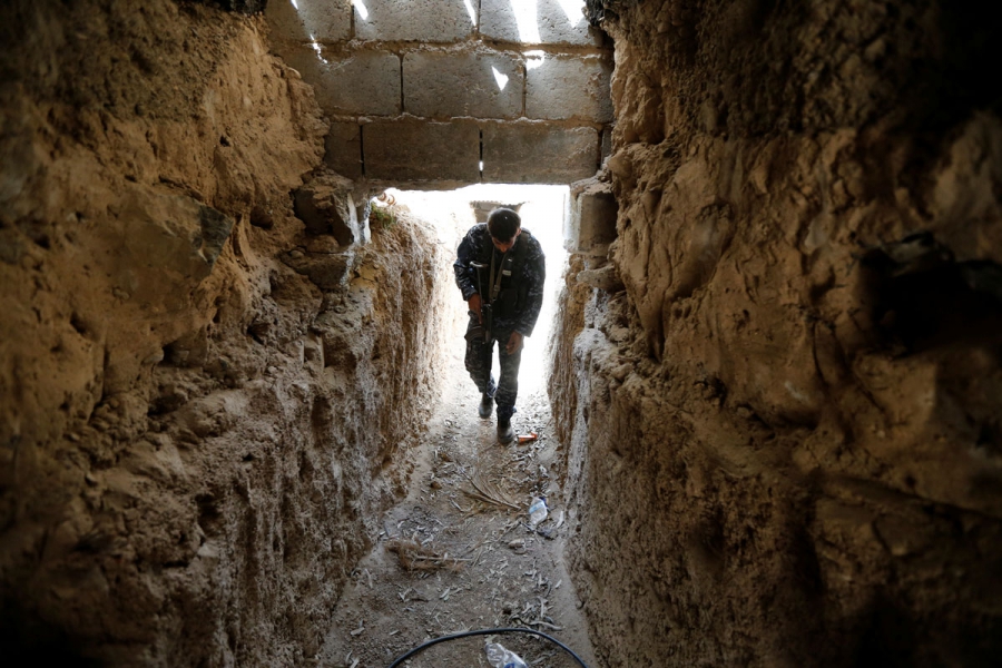 Iraklı Şii Bedir Tugayları'ndan bir savaşçı , IŞİD tarafından Felluce'nin dış mahallelerine inşa edilmiş bir tünelde silahıyla ilerliyor