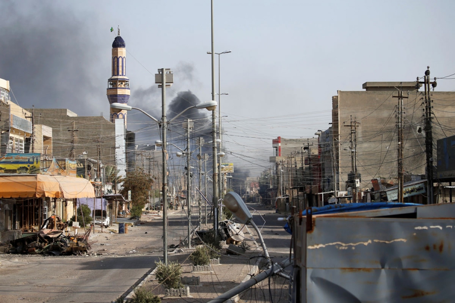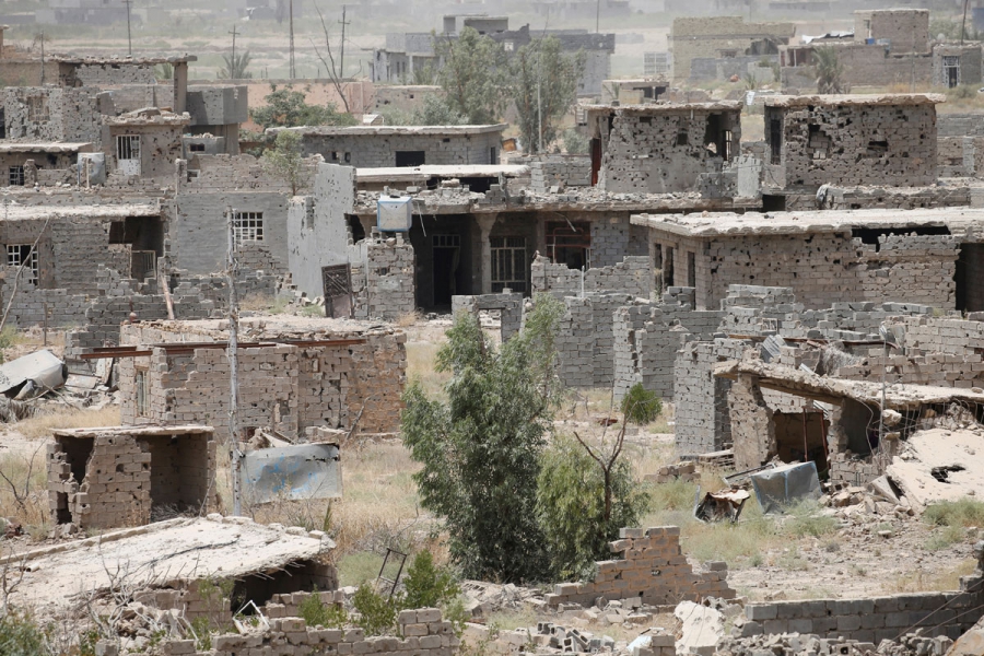 Felluce'nin dış mahallelerinde, çatışmalar sonucu tahrip olmuş ve yıkılmış binalar